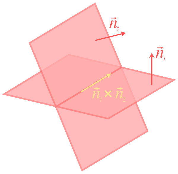 Denna linjes riktningsvekor är ortogonal mot båda planens normalvektorer. Tack vare detta kan vi beräkna linjens riktningsvektor genom att använda kryssprodukten.